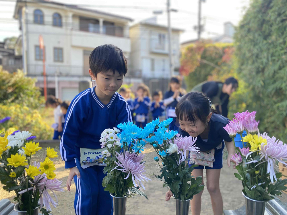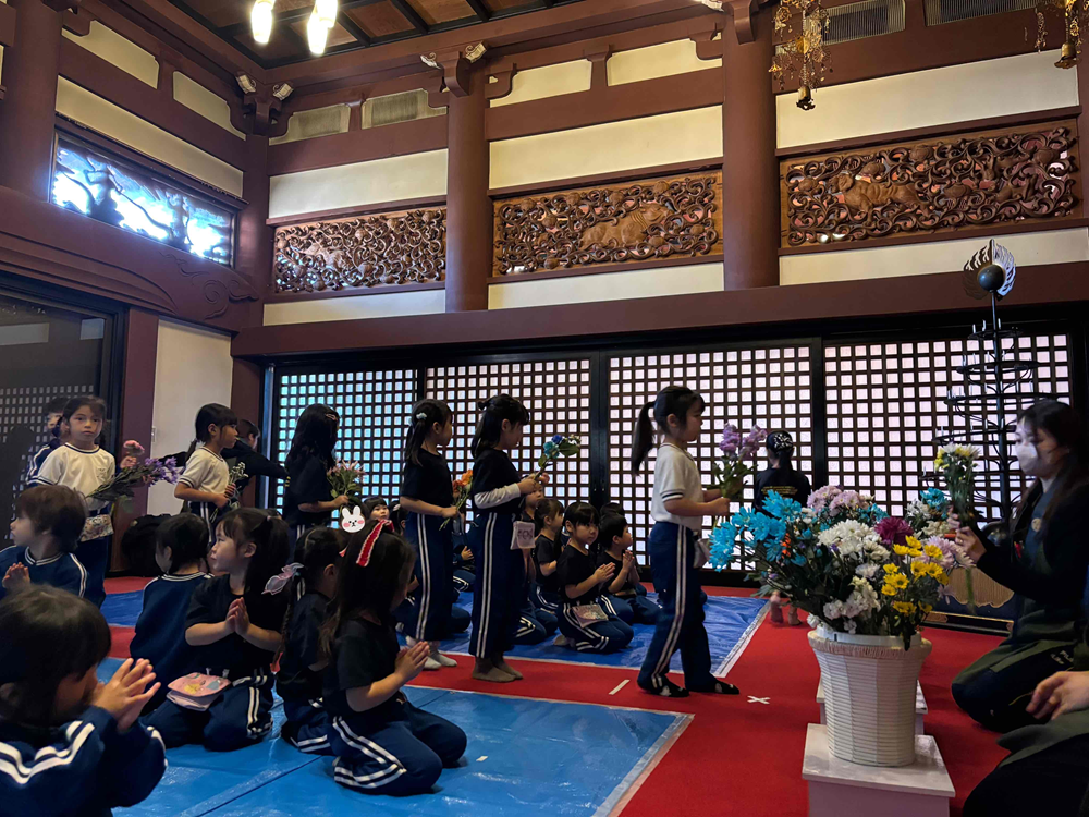 家から持ってきたお花を持って、みんな嬉しそうにお寺にお参りに行きました☺